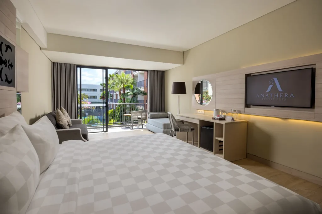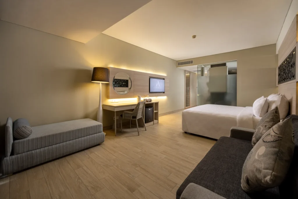 A thoughtfully designed space with warm tones and soft lighting, our Deluxe Room offers 24 square meters of quiet comfort. Whether you’re traveling solo or as a couple, this room provides a flexible choice between twin or king-size bedding — perfect for a restful stay in one of the best hotels in Kuta.